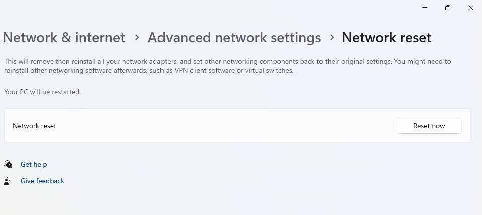 Network Reset can solve connection problems that might occur after upgrading versions or fix problems connecting to shared network drives. Reset removes all network adapters and adapter settings from your PC. After you restart your computer, any network adapters are reinstalled, and the settings re-enabled.